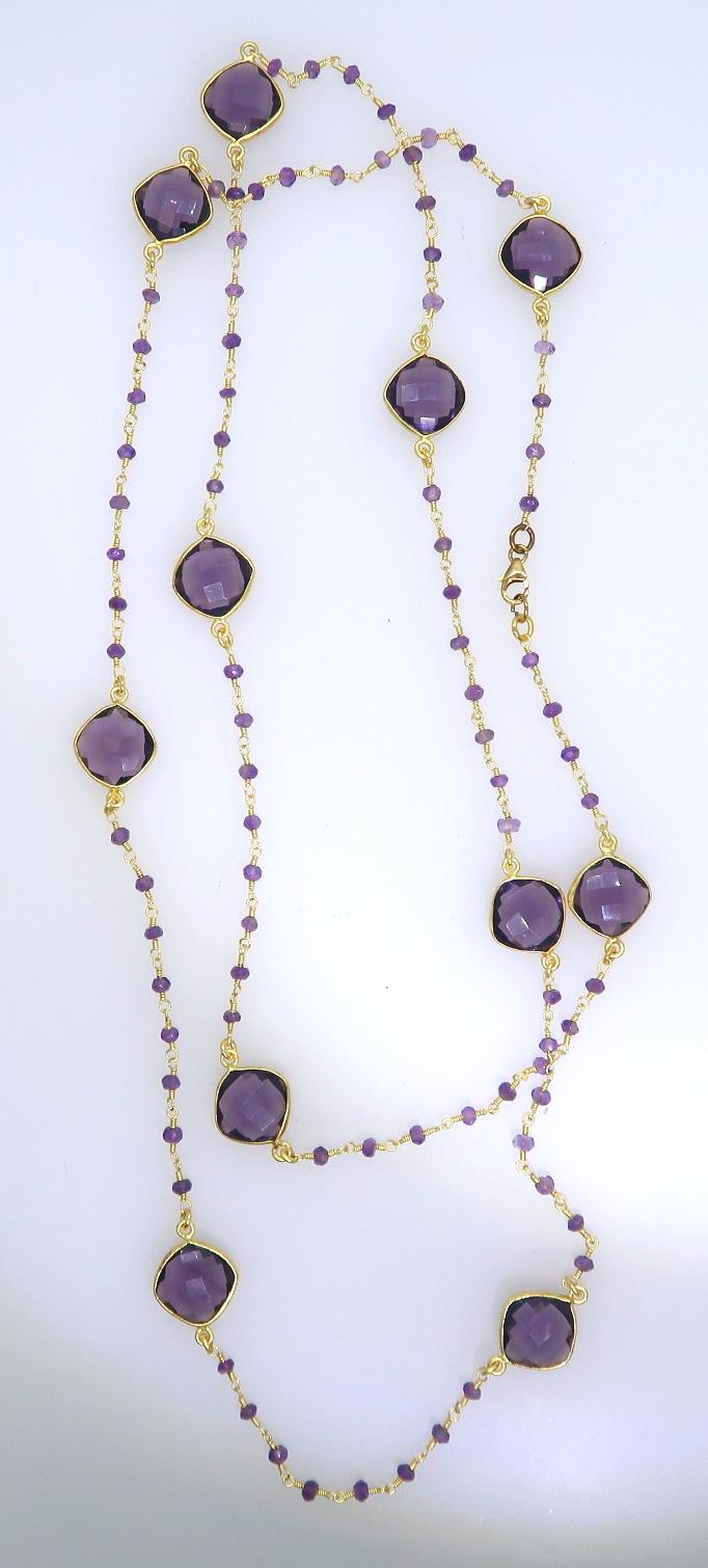 Amethyst bead fashion necklace with eleven large amethyst stations and gold overlay accents, 40″ long. Can be worn long or doubled.