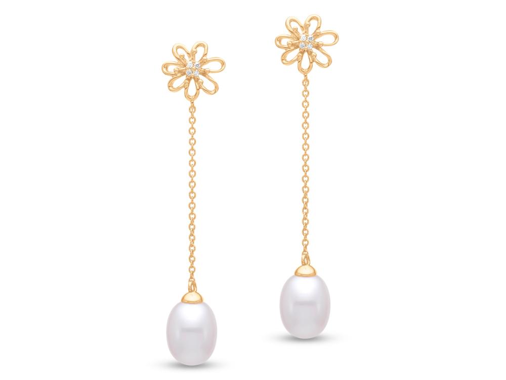 MASTOLONI – 14K Yellow Gold 7.5-8MM White Rice Shaped Freshwater Pearl Earring with 8 Diamonds 0.04 TCW