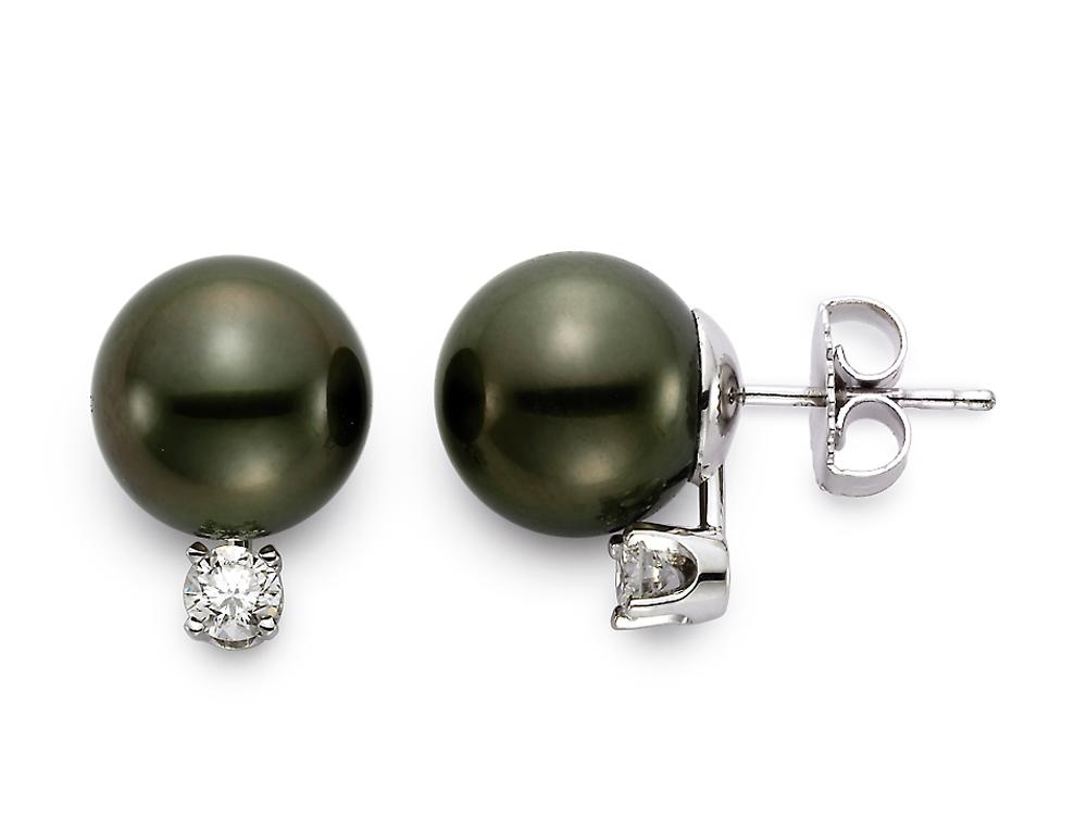 MASTOLONI – 18K White Gold 11-11.5MM Black Round Tahitian Pearl Earring with 2 Diamonds 0.40 TCW