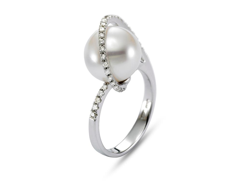 MASTOLONI – 18K White Gold 11MM White Round South Sea Pearl Ring with 31 Diamond 0.30 TCW