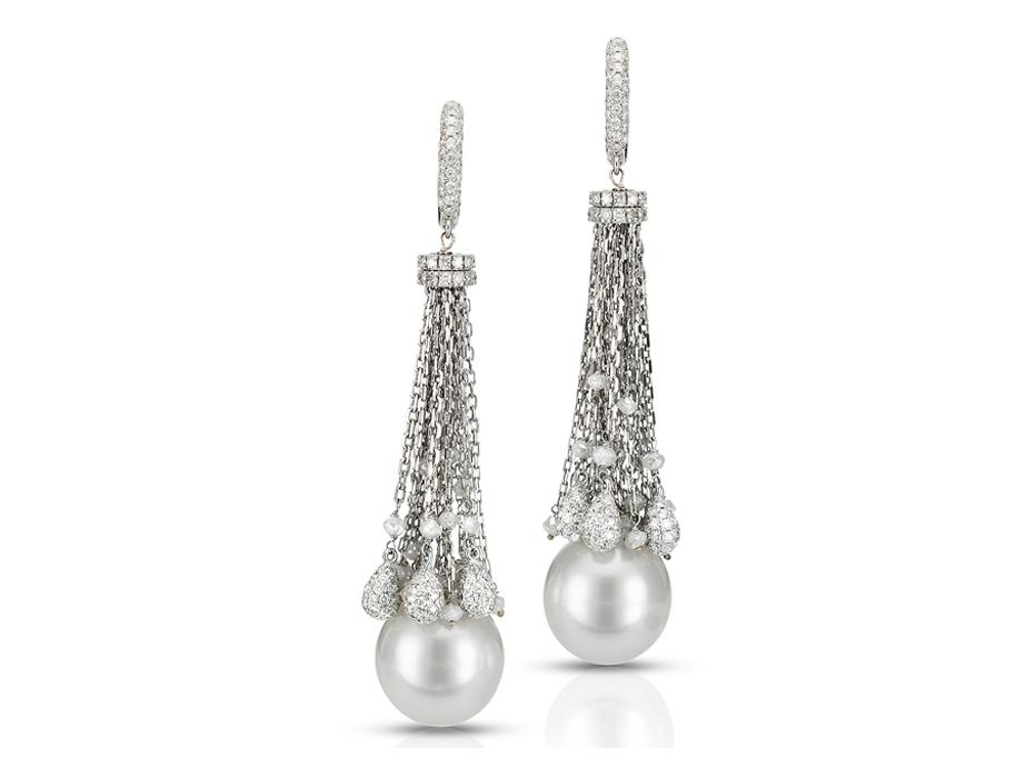 MASTOLONI – 18K White Gold 13.3-14.8MM White Oval South Sea Pearl Clip Back Earring with Diamonds 6.37 TCW 4 Inches