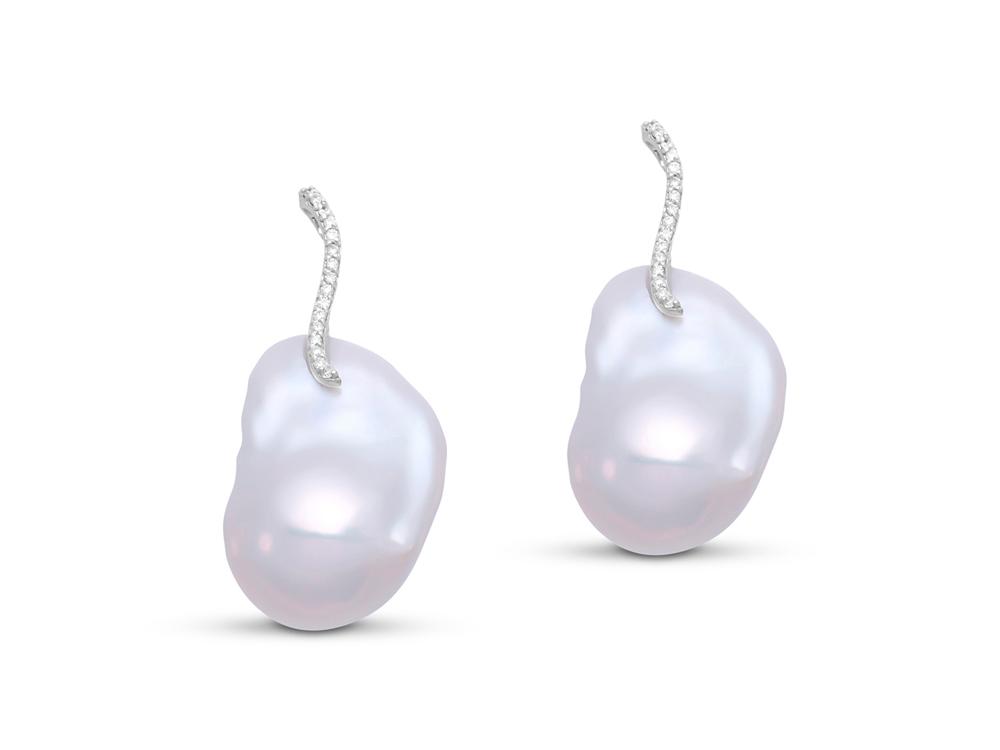 MASTOLONI – 18K White Gold 17-20MM White Baroque Freshwater Pearl Earring with 32 Diamonds 0.13 TCW