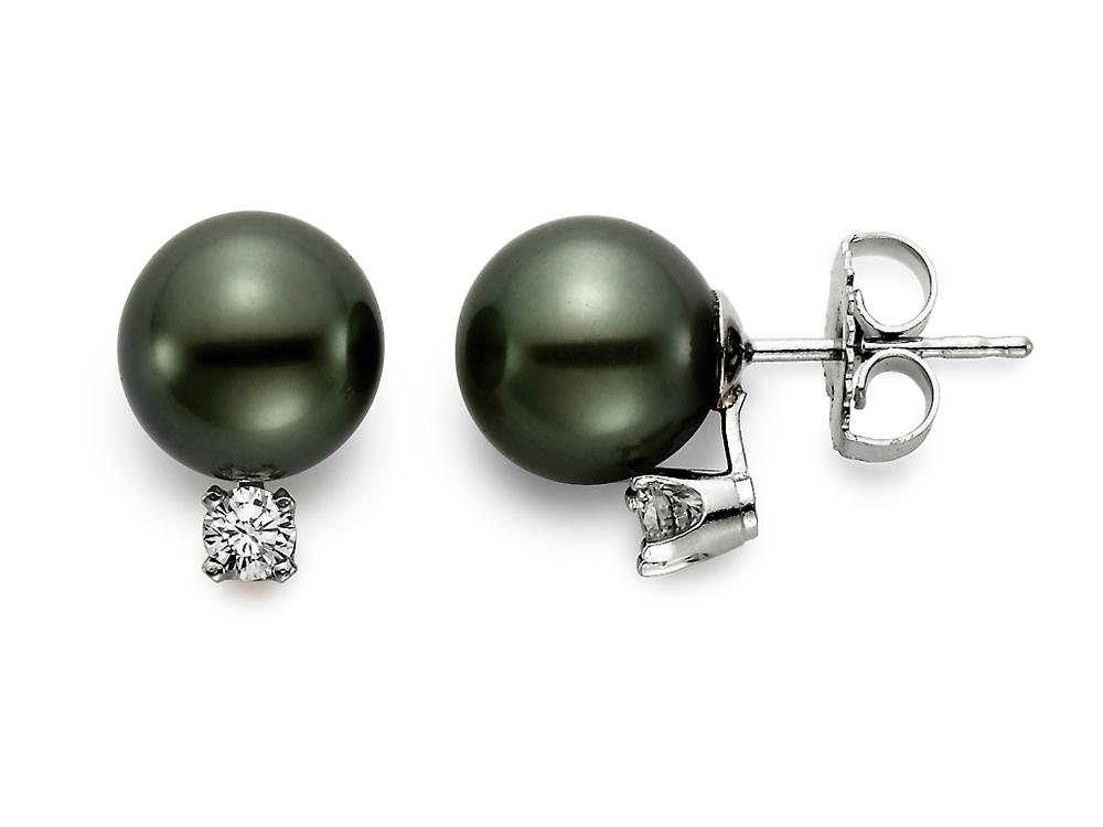 MASTOLONI – 18K White Gold 9-9.5MM Black Round Tahitian Pearl Earring with 2 Diamonds 0.25 TCW