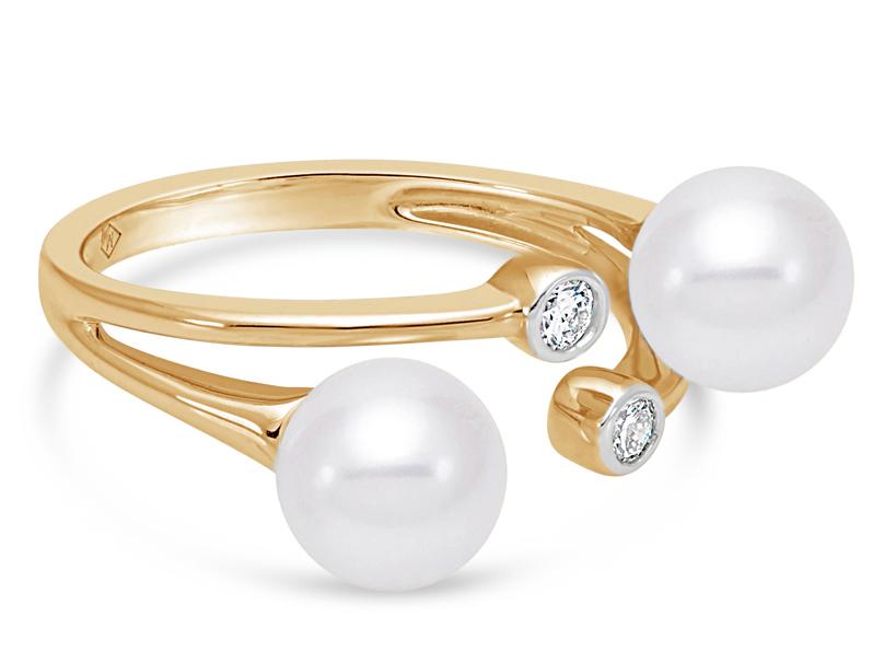 MASTOLONI – 18K Yellow Gold 7-7.5MM White Round Cultured Pearl Ring with 2 Diamonds 0.12 TCW