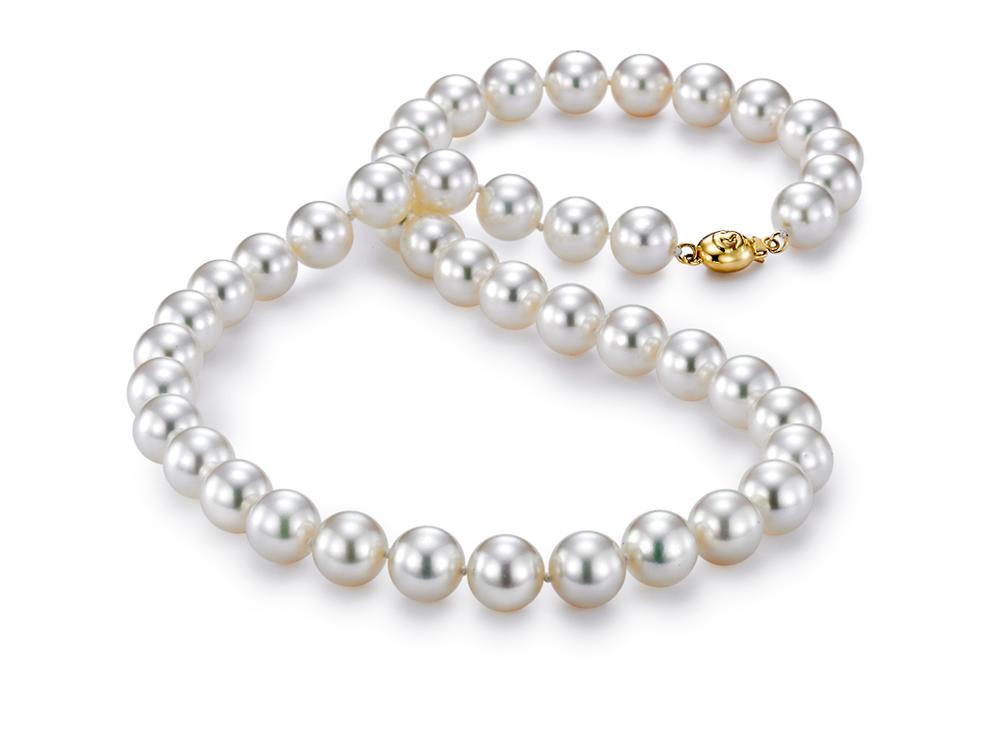 MASTOLONI – 18K Yellow Gold 9-9.5MM White Round “A” Quality Akoya Pearl Strand 16 Inches